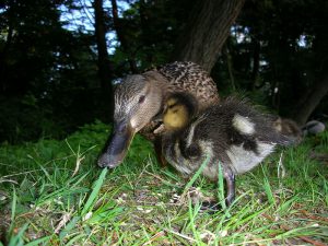 Die obigen Fotos zeigen oft „intime Momente auf Augenhöhe“. Wer sich darauf einlässt, wird Teil der Entenfamilie und wer genau hinsieht, kann sogar Details wie z. B. die Zunge der Kleinen erkennen. Ein Bild lässt vermuten, dass sich die Entenmutter zum Küken herunterbeugt, um die geheime, flüsternde Nachricht besser aufnehmen zu können. Aber das Bild ist nur ein lustiger Zufallsmoment.