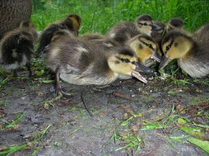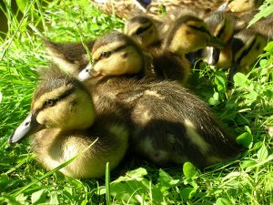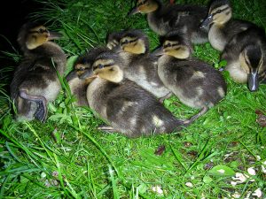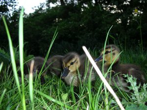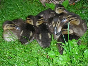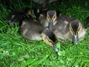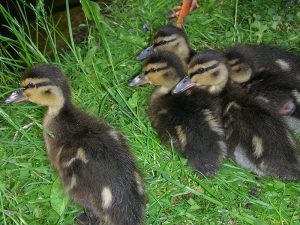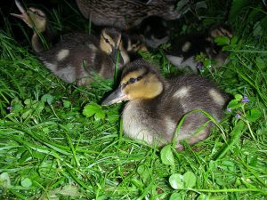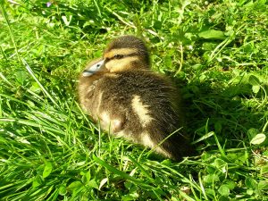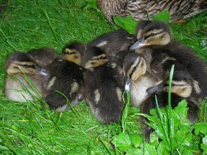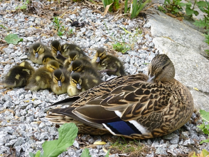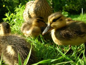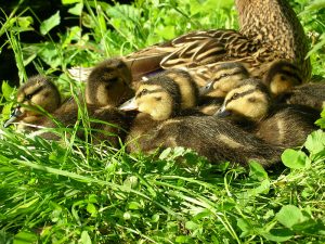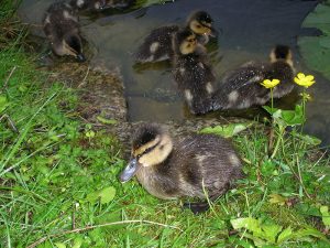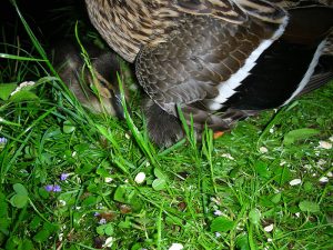 Die Stockente brütet ihre Eier im Nest erst dann aus, wenn sie alle gelegt hat – so können sämtliche Küken gleichzeitig schlüpfen und mit ihrer Mutter ins Wasser laufen. Entenküken sind Nestflüchter, suchen sich sofort selbständig ihr Futter und ahnen auch schon, wo ihre künftige Bürzeldrüse liegt. Ihre Lebenserwartung ist aufgrund der Gefahren zunächst sehr gering und steigert sich von Woche zu Woche. Die Entenmutter leistet Höchstes. Wenn es die Hälfte ihrer Küken ins Entenleben schafft, ist das ein gutes Ergebnis – die Natur kalkuliert Abgänge mit ein.
